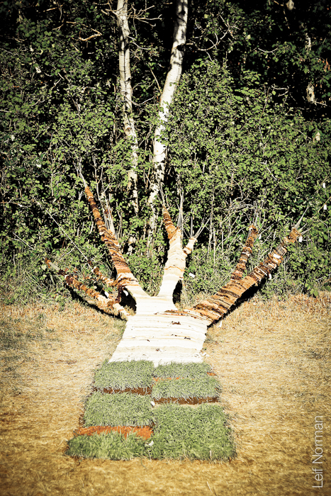 Site-specific installation by Coral Maloney and Danielle Mondor. Raw sheep’s wool, paper tags, topsoil, string, felt, found fabric, wheatgrass, plastic seedling trays. Prairie Outdoor Exhibition, Winnipeg Folk Festival, Bird’s Hill Provincial Park (2011). Photo by Leif Norman.